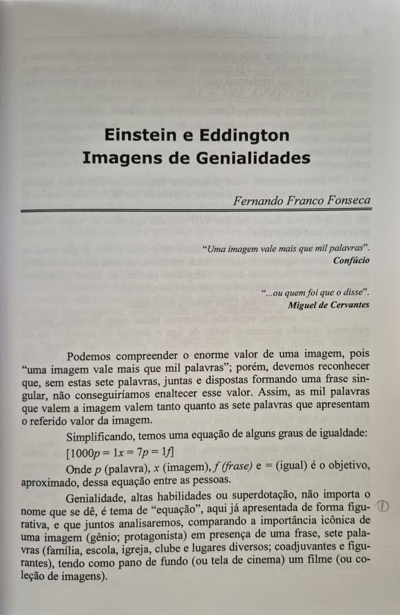 Genialidade, altas habilidades ou superdotação, não importa o nome que se dê, é tema de “equação”, aqui já apresentada de forma figurativa, e que juntos analisaremos, comparando a importância icônica de uma imagem (gênio; protagonista) em presença de uma frase, sete palavras (família, escola, igreja, clube e lugares diversos; coadjuvantes e figurantes), tendo como pano de fundo (ou tela de cinema) um filme (ou coleção de imagens).