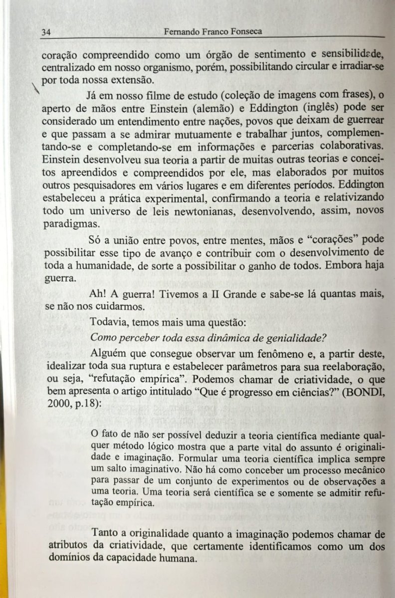 Já em nosso filme de estudo (coleção de imagens com frases), o aperto de mãos entre Einstein (alemão) e Eddington (inglês) pode ser considerado um entendimento entre nações, povos que deixam de guerrear e que passam a se admirar mutuamente e trabalhar juntos, complementando-se e completando-se em informações e parcerias colaborativas. Einstein desenvolveu sua teoria a partir de muitas outras teorias e conceitos apreendidos e compreendidos por ele, mas elaborados por muitos outros pesquisadores em vários lugares e em diferentes períodos. Eddington estabeleceu a prática experimental, confirmando a teoria e relativizando todo um universo de leis newtonianas, desenvolvendo, assim, novos paradigmas.