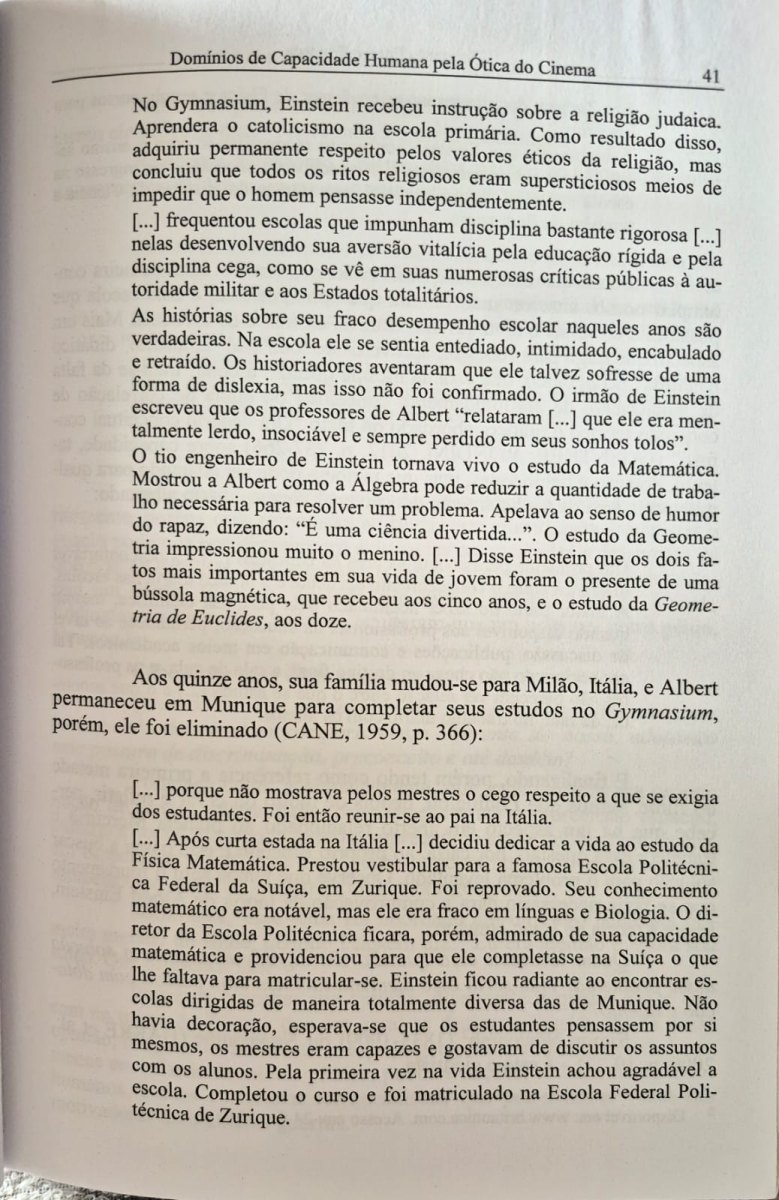 • Como tratar do assunto dotação e talento na escola? Einstein e sua vida escolar. Além das informações a esse respeito já abordadas anteriormente, especialmente quando comparado as qualidades de sua primeira esposa, Mileva Maric, apresentaremos alguns outros relatos. Gilberto Dimenstein e Rubem Alves dialogam entre si, considerando alguns fatos escolares e alguns personagens reais, como Einstein. Acompanhemos esse diálogo (DIMENSTEIN; ALVES, 2004, p. 33):